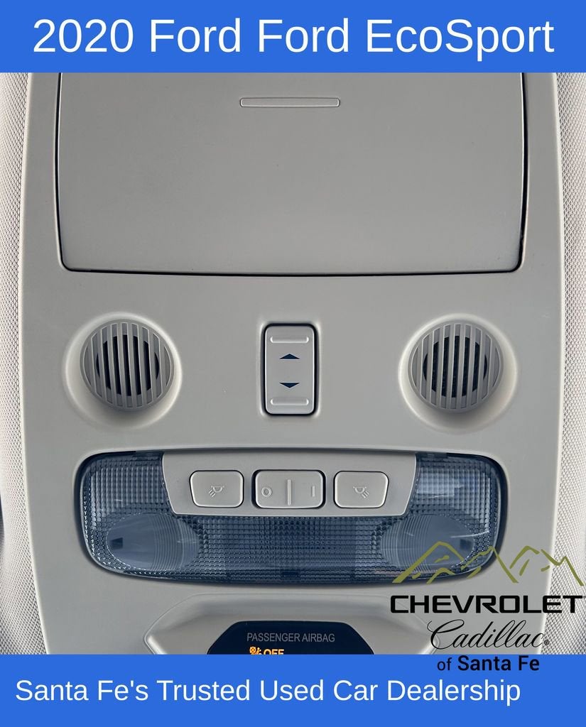 Chevrolet Cadillac of Santa Fe proudly offers this 2020 Lightning Blue Ford EcoSport SES 4WD is well equipped and includes these features and benefits: Equipment Group 300A, SES Black Appearance Package (Black Hood Decal, Black Painted Roof, and Black Spoiler), 3.51 Axle Ratio, 4-Wheel Disc Brakes, 7 Speakers, ABS brakes, ActiveX Seating Material Heated Front Bucket Seats, Air Conditioning, Alloy wheels, AM/FM radio: SiriusXM, AppLink/Apple CarPlay and Android Auto, Auto-dimming Rear-View mirror, Automatic temperature control, Brake assist, Bumpers: body-color, Compass, Delay-off headlights, Driver door bin, Driver vanity mirror, Dual front impact airbags, Dual front side impact airbags, Electronic Stability Control, Emergency communication system: SYNC 3 911 Assist, Exterior Parking Camera Rear, Front anti-roll bar, Front Bucket Seats, Front Center Armrest, Front fog lights, Front reading lights, Front wheel independent suspension, Fully automatic headlights, Heated door mirrors, Heated front seats, Heated steering wheel, Illuminated entry, Knee airbag, Leather Shift Knob, Low tire pressure warning, Navigation System, Occupant sensing airbag, Outside temperature display, Overhead airbag, Overhead console, Panic alarm, Passenger door bin, Passenger vanity mirror, Power door mirrors, Power driver seat, Power moonroof, Power steering, Power windows, Radio data system, Radio: AM/FM Stereo w/MP3 Capable, Rain sensing wipers, Rear anti-roll bar, Rear Parking Sensors, Rear seat center armrest, Rear side impact airbag, Rear window defroster, Rear window wiper, Remote keyless entry, Roof rack: rails only, SiriusXM Radio, SiriusXM Traffic & Travel Link, Speed control, Speed-sensing steering, Split folding rear seat, Spoiler, Steering wheel mounted audio controls, SYNC 3 Communications & Entertainment System, Tachometer, Telescoping steering wheel, Tilt steering wheel, Traction control, Trip computer, Turn signal indicator mirrors, Variably intermittent wipers, and Wheels: 17 Painted Machined Aluminum.